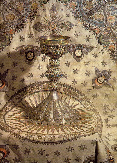 Silver chalice on gold-embroidered tablecloth, 18th century.